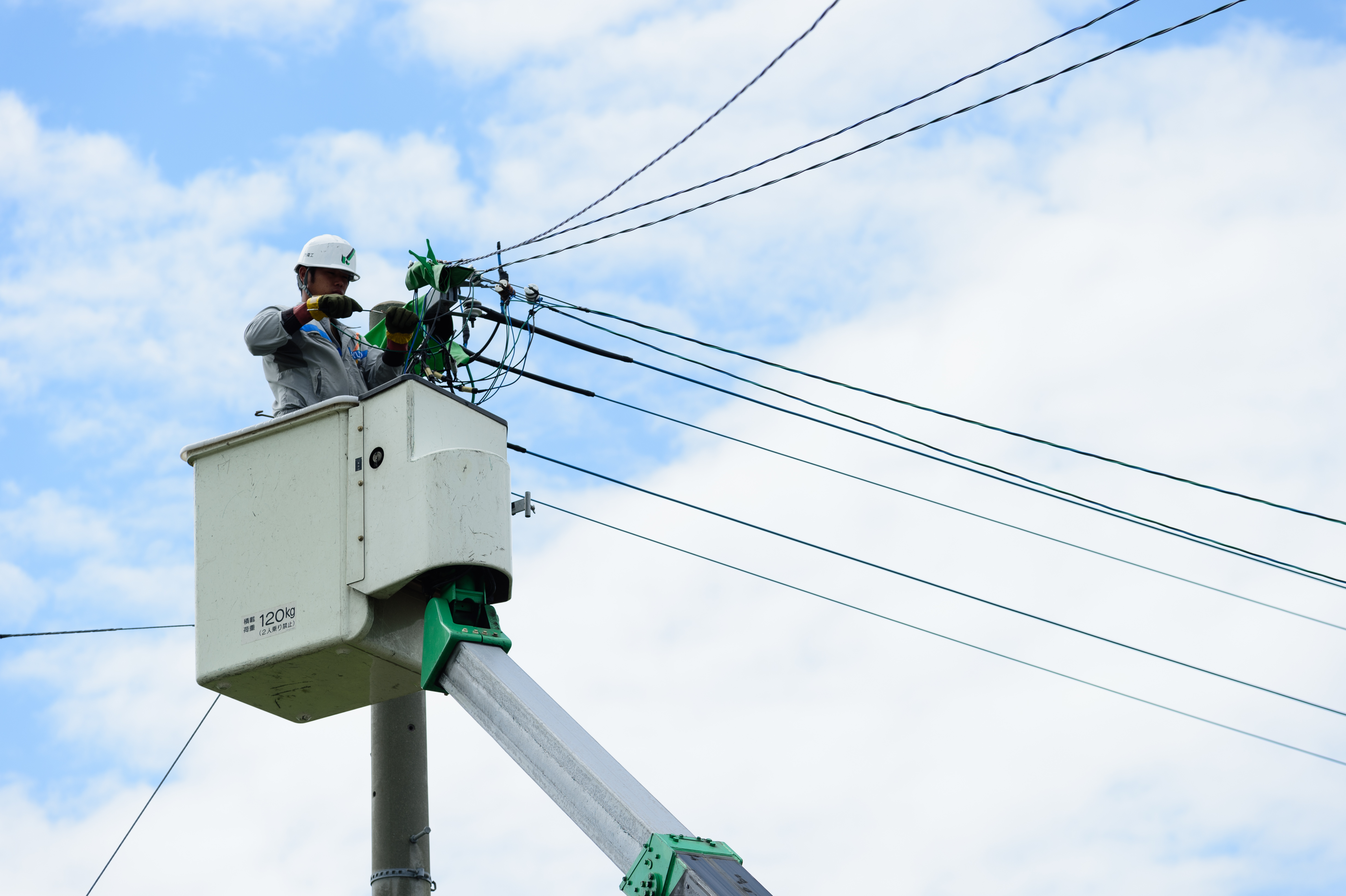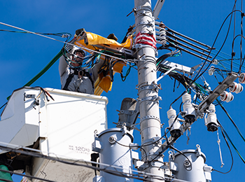 電線の取り付け、電気メーターの設置、電柱の建て替えなど、街の電気インフラを整備・保守する仕事です。